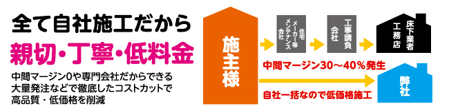 自社施工することにより紹介料などの中間マージンを排除や、適材適所への人員配置、他細かい経費を見直しすることにより安心価格をご提供可能となりました。施工品質については、長年の経験がある自社職人が施工をすることで、「低価格×高品質」で工事をご提供することが可能です。