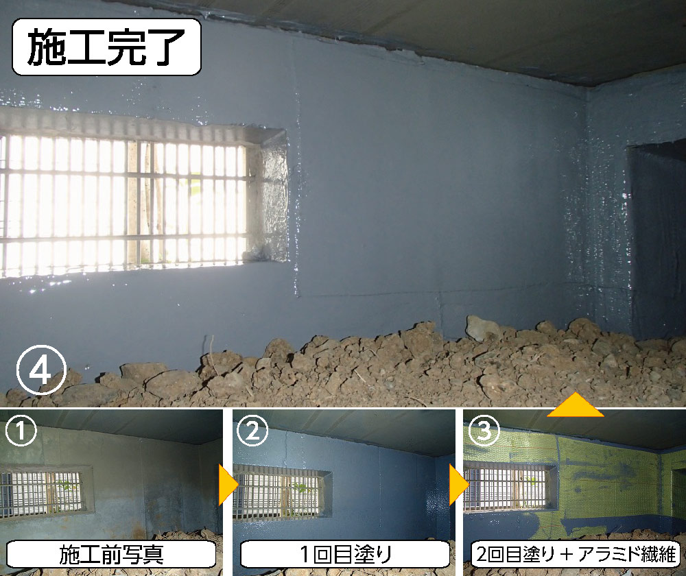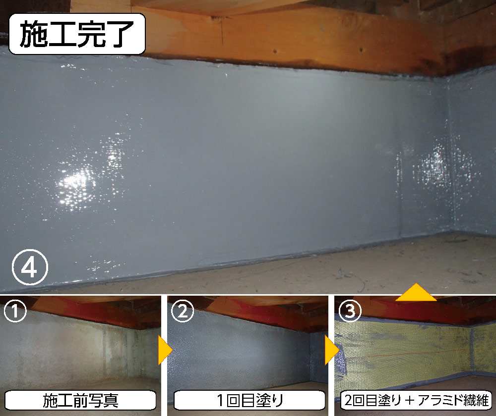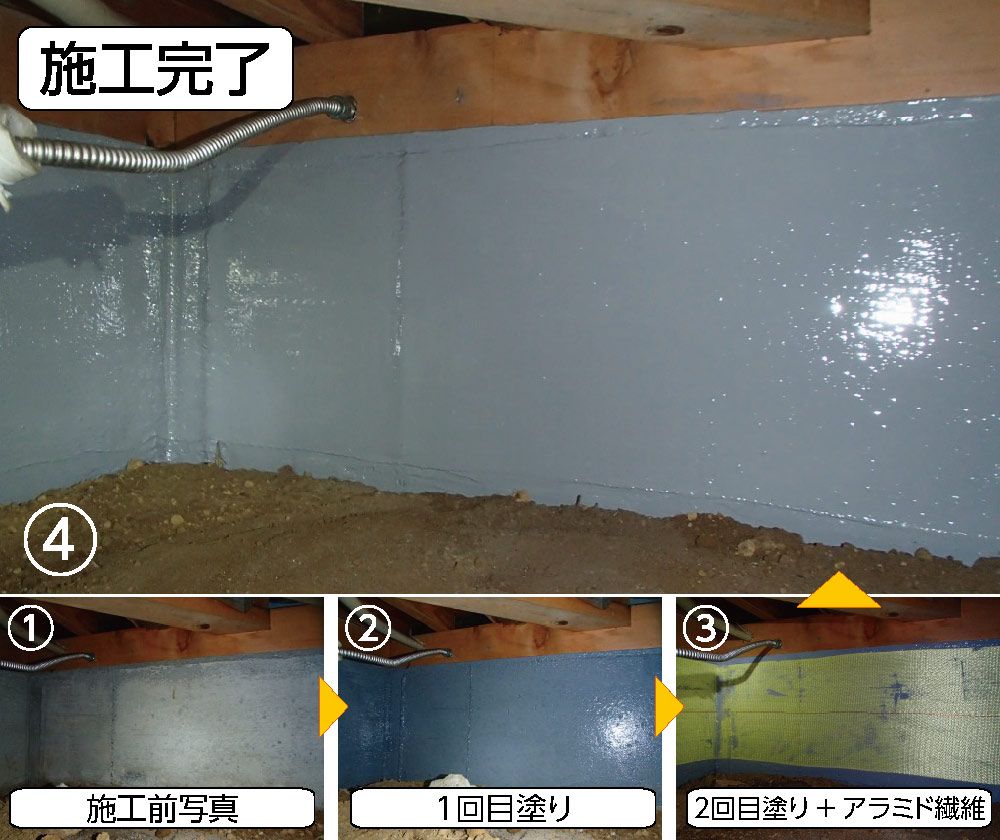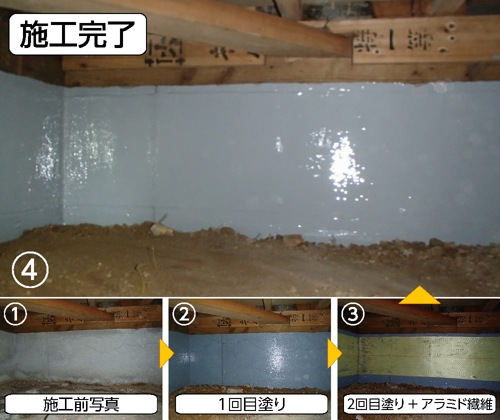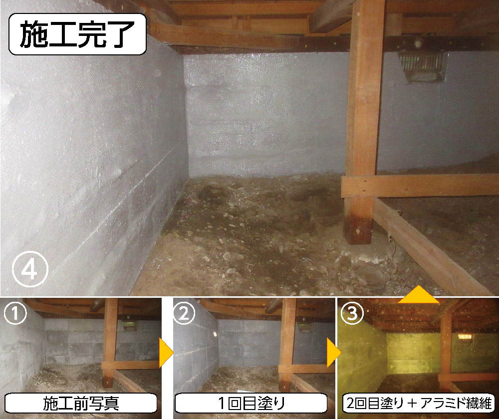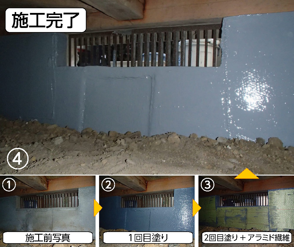 ・内側の内部基礎の劣化が進み、剥離がいたるところで見受けられました。剥離している部分を重点的に施工しました。湿気が多いお家でしたので、そのままだとひび割れの進行もあったかと思いますが、施工で、留めることができて安心です。