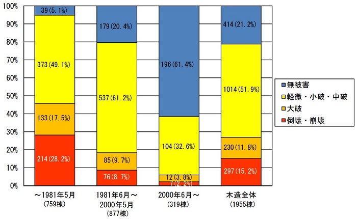 実際、2016年に発生した熊本地震で震度7の揺れを記録した益城町でも、2000年以降に建てられた木造建築では大破・崩壊・倒壊した家の割合が6.0%に留まっています。