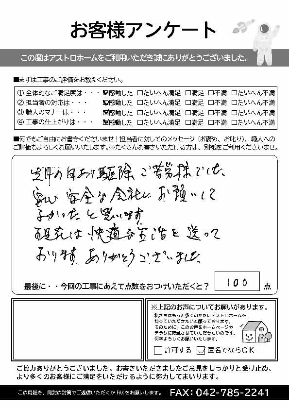 先月の白あり駆除ご苦労様でした。安心安全な会社にお願いしてよかったと思います。